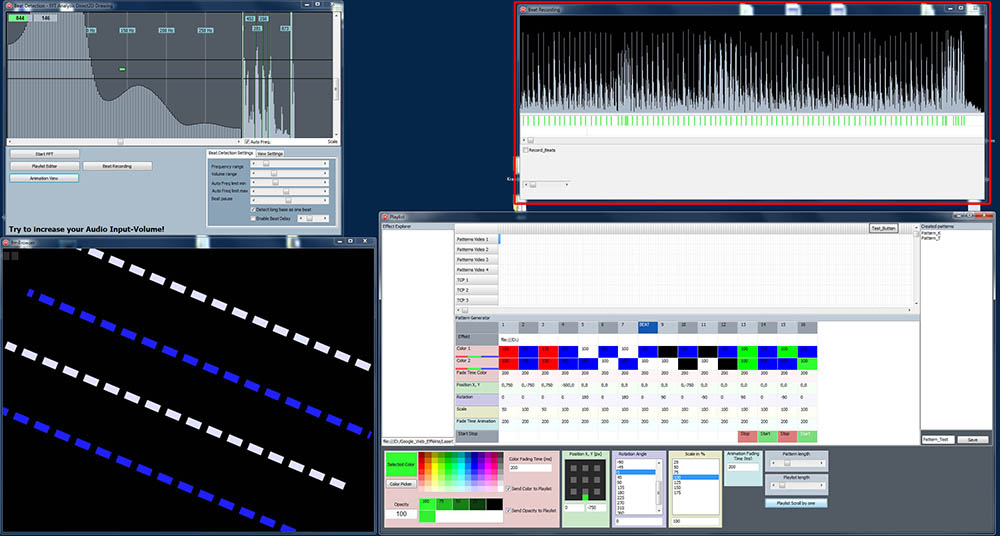 Es ist ein eigenständiges Programm zur Erstellung von takt- und zeitgesteuerten Beamershows. Der Takt der Beaterkennung soll sich aber auch zu anderer DMX-Software übertragen lassen, entweder über MIDI oder mit einem virtuellen Klick per Windows Handle auf einen Button aus der DMX Software welcher einen Beat erzeugt (So der Plan). Die Beaterkennung ist somit theoretisch auch für Lauflichter geeignet, die mit einem Programm erstellt wurden, welches den Takt meiner Software empfangen kann.